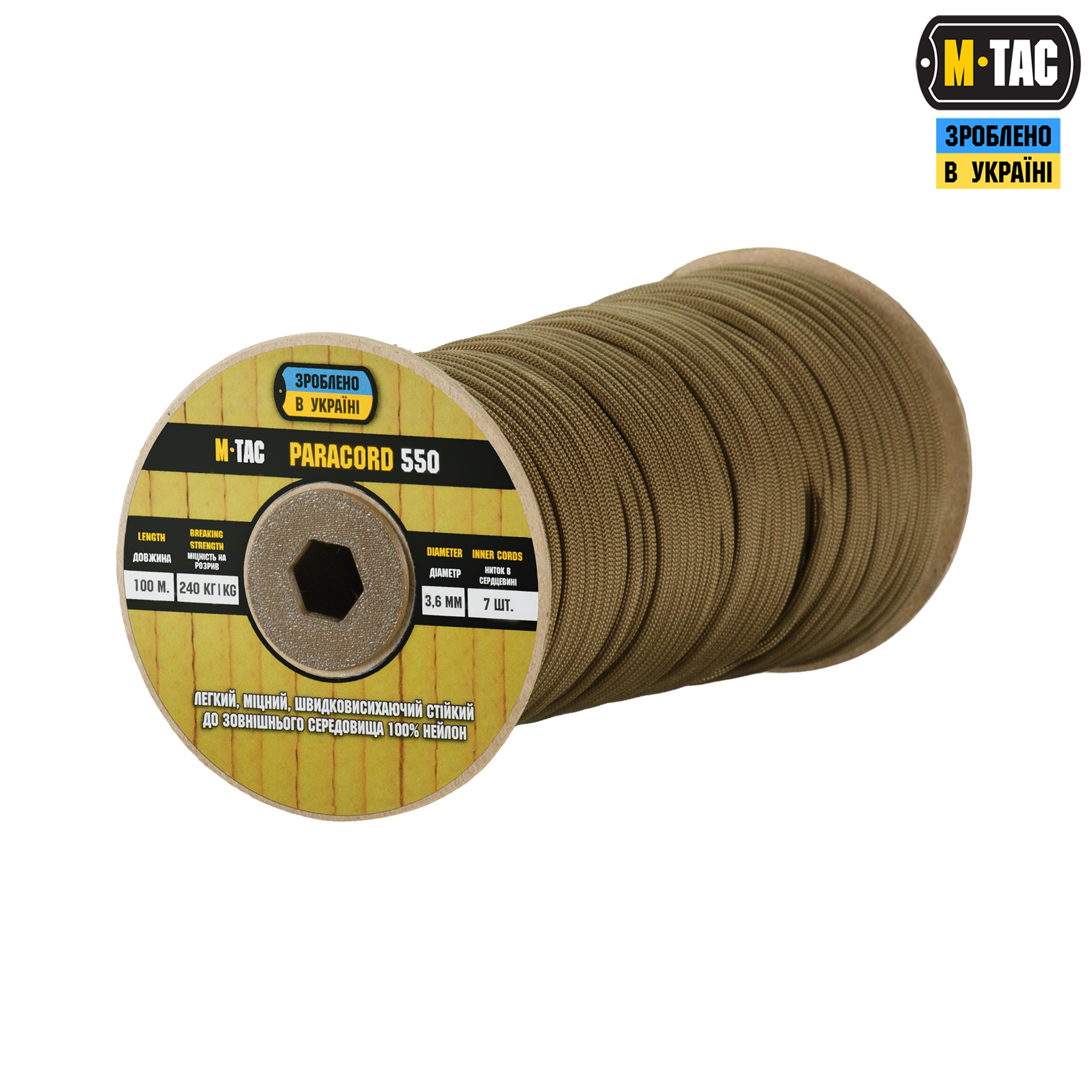 M-TAC ПАРАКОРД 550 TYPE III 100M – стане незамінним елементом спорядження як у польових умовах, так і під час активного відпочинку. Виготовлений зі 100% нейлону – легкого та водночас зносостійкого матеріалу. Складається із зовнішнього обплетення (зі зміцненою структурою) та осердя, які в комбінації забезпечують високу міцність на розрив та невелику вагу. Для зручності використання, паракорд розміщено на котушці з пресованого картону.