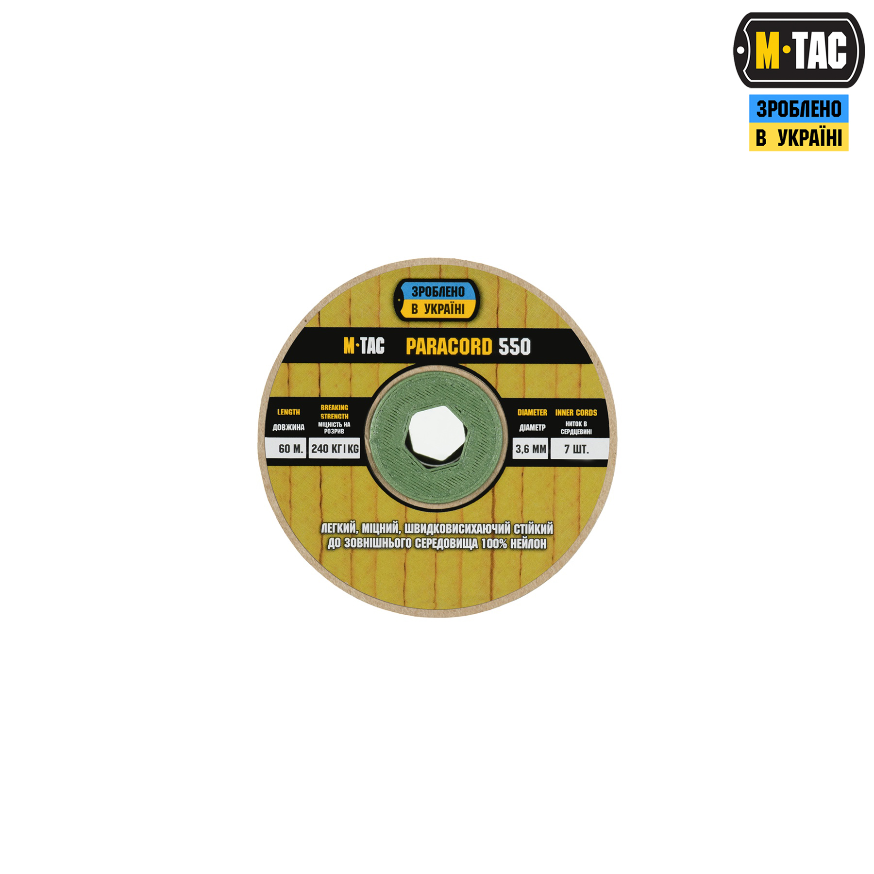 M-TAC ПАРАКОРД 550 TYPE III 60M – стане незамінним елементом спорядження як у польових умовах, так і під час активного відпочинку. Виготовлений зі 100% нейлону – легкого та водночас зносостійкого матеріалу. Складається із зовнішнього обплетення (зі зміцненою структурою) та осердя, які в комбінації забезпечують високу міцність на розрив та невелику вагу. Для зручності використання, паракорд розміщено на котушці з пресованого картону.