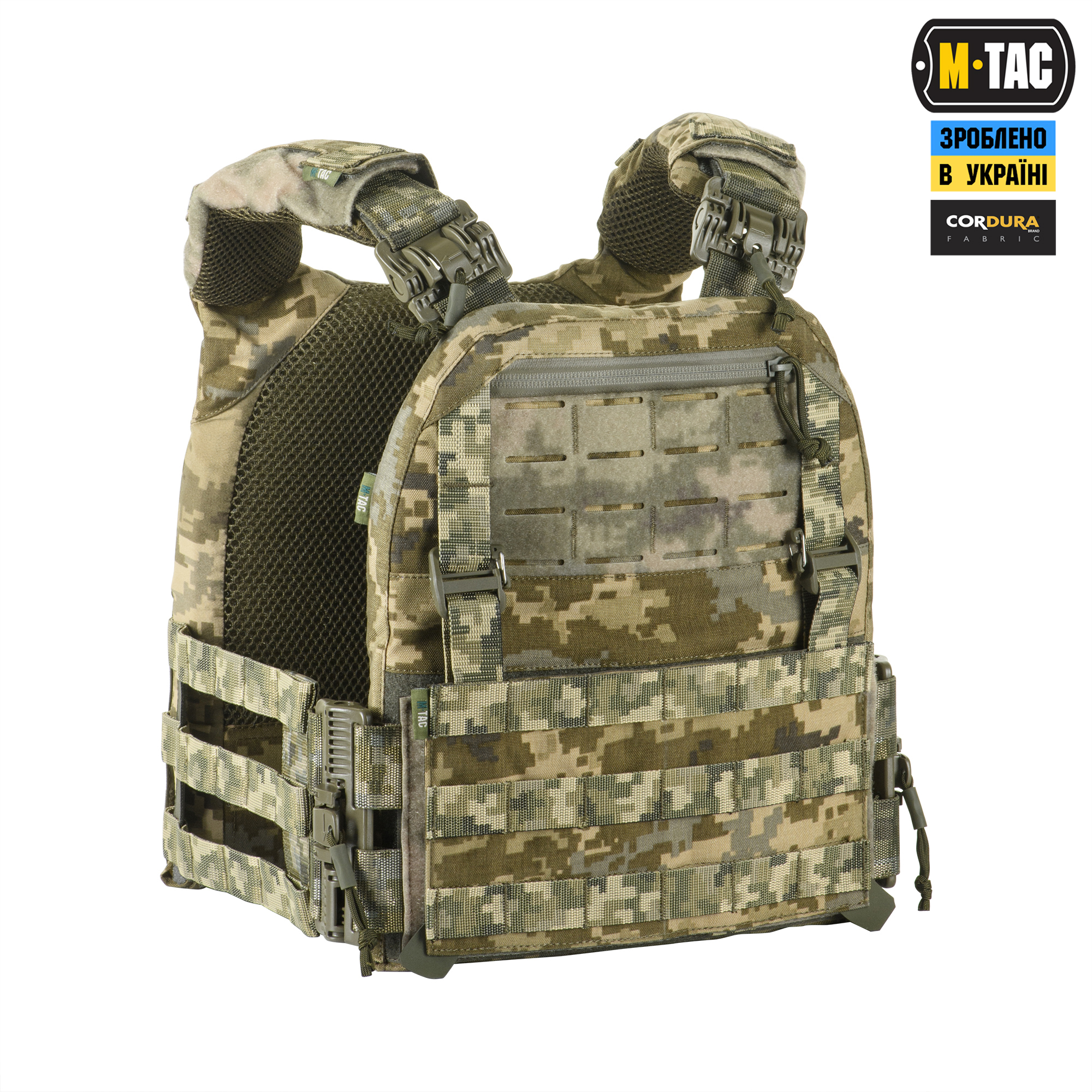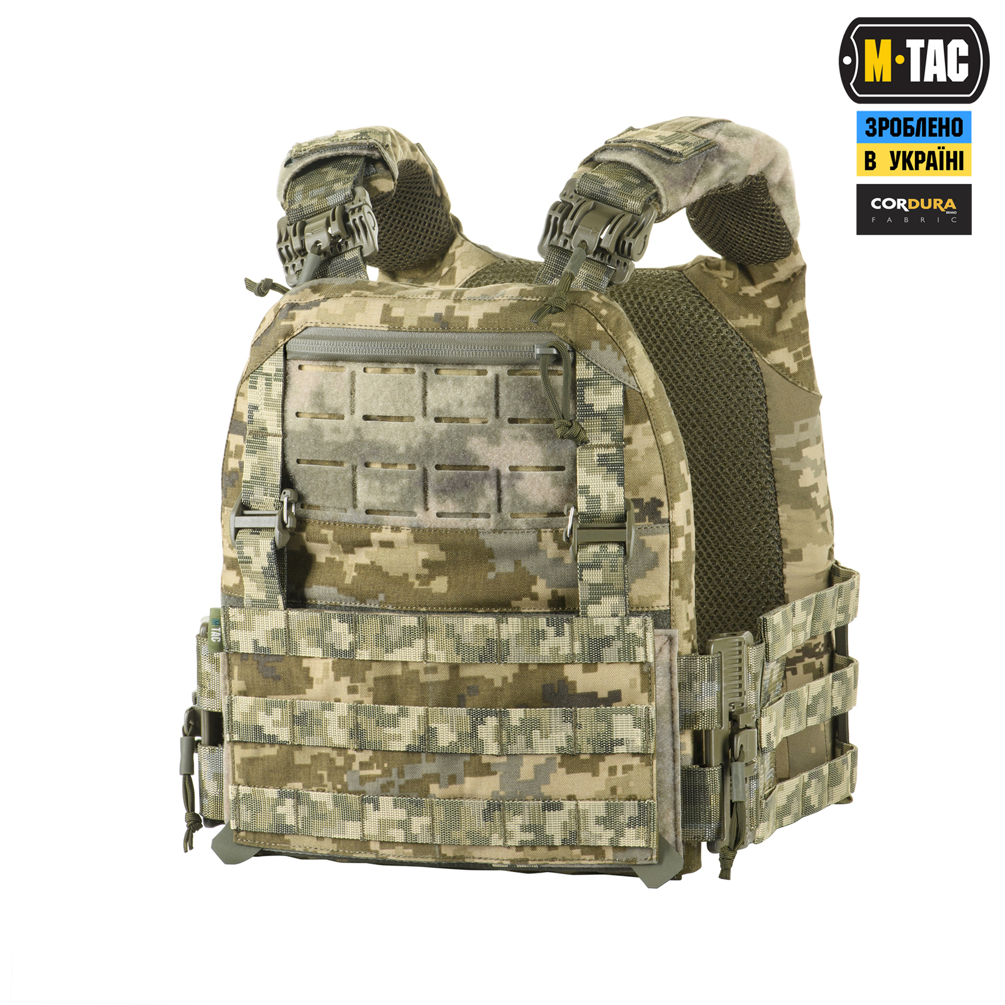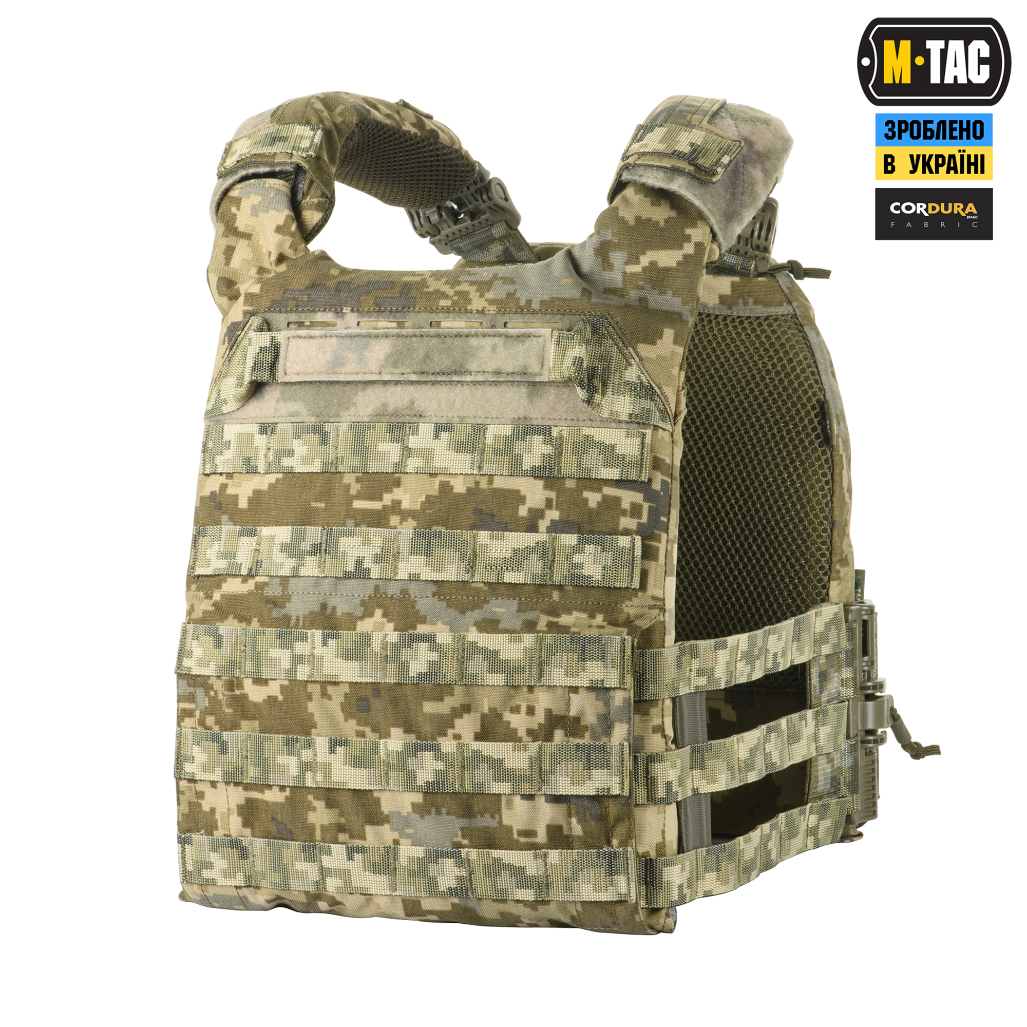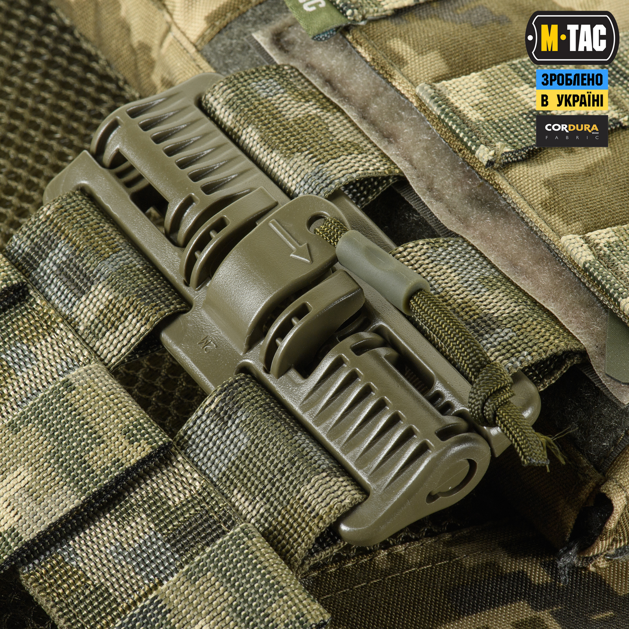 M-Tac плитоноска Cuirass Fast QRS Gen.II – це нова генерація індивідуального бронезахисту в лінійці PLATE CARRIER. Сумісна зі стандартними бронеплитами ESAPI (USA) Medium (31.8 х 24.1 см) зі скошеними верхніми кутами. Нове покоління M-Tac плитоноски Cuirass Fast QRS оснащене спеціальною Molle панеллю, що дозволить розмістити підсумки, кобури, аптечки, органайзери та інше спорядження. Щоб уникнути випадкового зривання з основи Velcro, вона кріпиться до строп на плитоносці за допомогою карабінів Woojin. Основною особливістю моделі FAST є фастекси швидкого скидання з фурнітури 2М ROC Buckle, що розміщені на плечовій частині плитоноски. Таке рішення дозволяє за лічені секунди розстібнути плитоноску, просто потягнувши за темляки у напрямку стрілочок. Плитоноска виготовлена з високоякісного матеріалу Cordura 500D – надміцної тканини, стійкої до стирання і високих навантажень. З внутрішньої сторони є вставки з 3D сітки, які забезпечують амортизацію та циркуляцію повітря. Ергономічні плечові лямки зручні у використанні й органічно повторюють контури тіла. Скелетоподібний камербанд значно зменшує вагу виробу і при необхідності дозволяє розмістити підсумки. На фронтальній частині виробу знаходиться Velcro-панель з прорізами, на яку можна закріпити Molle-сумісне спорядження та ID-ідентифікатори. Вгорі плитоноски дизайнери бренду передбачили невелике адміністративне відділення на вологозахисній блискавці AquaGuard. Дана кишеня розрахована на зберігання невеликих плоских речей, таких як посвідчення, ключі, запальничка та інші предмети. Ззаду є класичний Molle-інтерфейс і ручка для евакуації, яка в похідному положенні фіксується до спинки панелями Velcro. Плитоноска Cuirass Fast QRS Gen.II стане відмінним вибором для любителів сучасного тактичного спорядження.Завдяки своїм унікальним якостям Cordura широко застосовується в тактичному спорядженні військових, сил правопорядку і сил спеціального призначення. В основному це матеріали з лінійною густиною 1000D і 500D. Лінійна щільність – це співвідношення маси нитки матерії і її довжини. Вимірюється в деньє (denier). Ця одиниця виміру в основному застосовується для нейлонових виробів. Відповідно – чим вище цей показник, тим щільніше і важче тканина. Фізико – технічні тканини CORDURA 1000D дуже високі, розривне навантаження становить близько 3000Н, роздирання – близько 150Н. Стійкість до стирання більше 50000 циклів. Використовується для одягу, чохлів, підсумків. Чи то тактичний рюкзак, підсумки або куртка. Вироби, пошиті з матеріалів CORDURA, безсумнівно, пройдуть випробування часом і відстанню. CORDURA – це міцність, надійність і стиль. За показниками міцності вона поза конкуренцією. Завдяки своїм унікальним якостям Cordura широко застосовується в тактичному спорядженні військових, сил правопорядку і сил спеціального призначення. В основному це матеріали з лінійною густиною 1000D і 500D. Лінійна щільність – це співвідношення маси нитки матерії і її довжини. Вимірюється в деньє (denier). Ця одиниця виміру в основному застосовується для нейлонових виробів. Відповідно – чим вище цей показник, тим щільніше і важче тканина. Фізико – технічні тканини CORDURA 1000D дуже високі, розривне навантаження становить близько 3000Н, роздирання – близько 150Н. Стійкість до стирання більше 50000 циклів. Використовується для одягу, чохлів, підсумків. Чи то тактичний рюкзак, підсумки або куртка. Вироби, пошиті з матеріалів CORDURA,