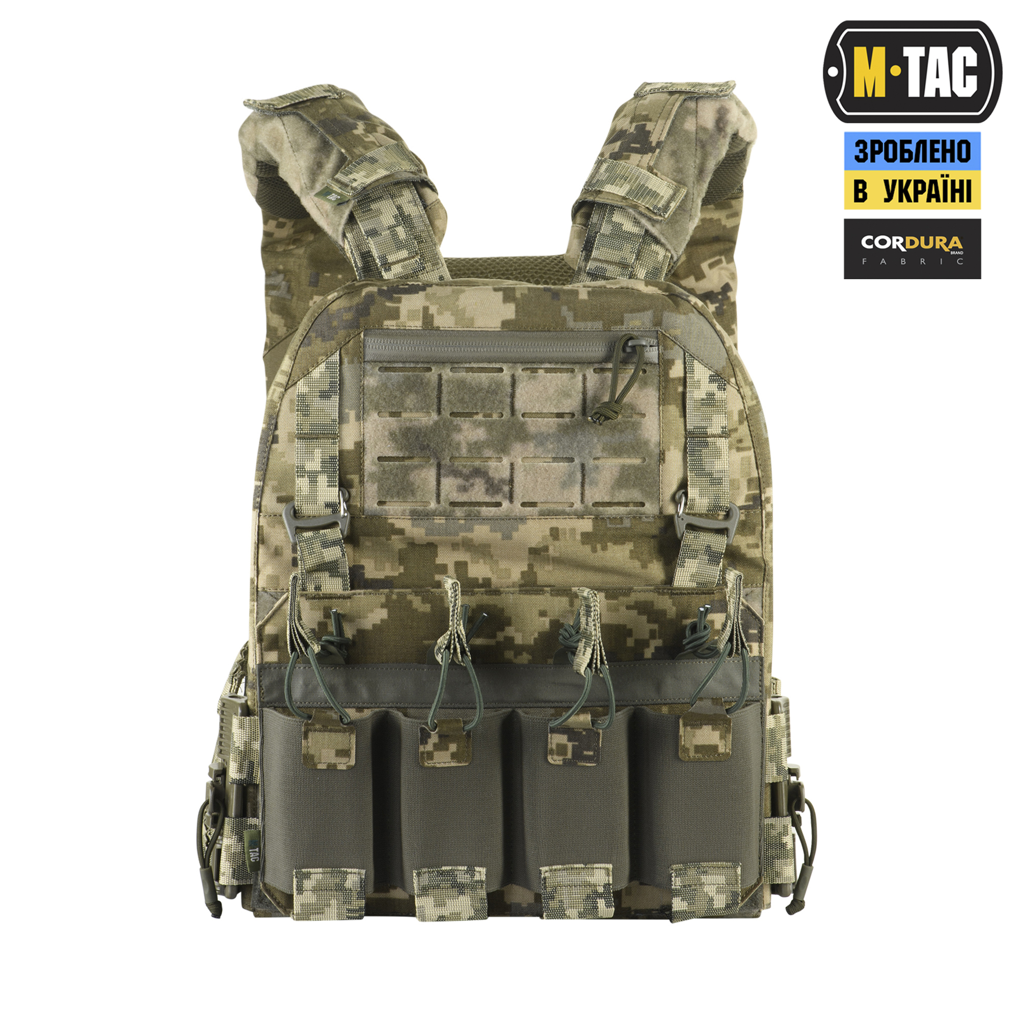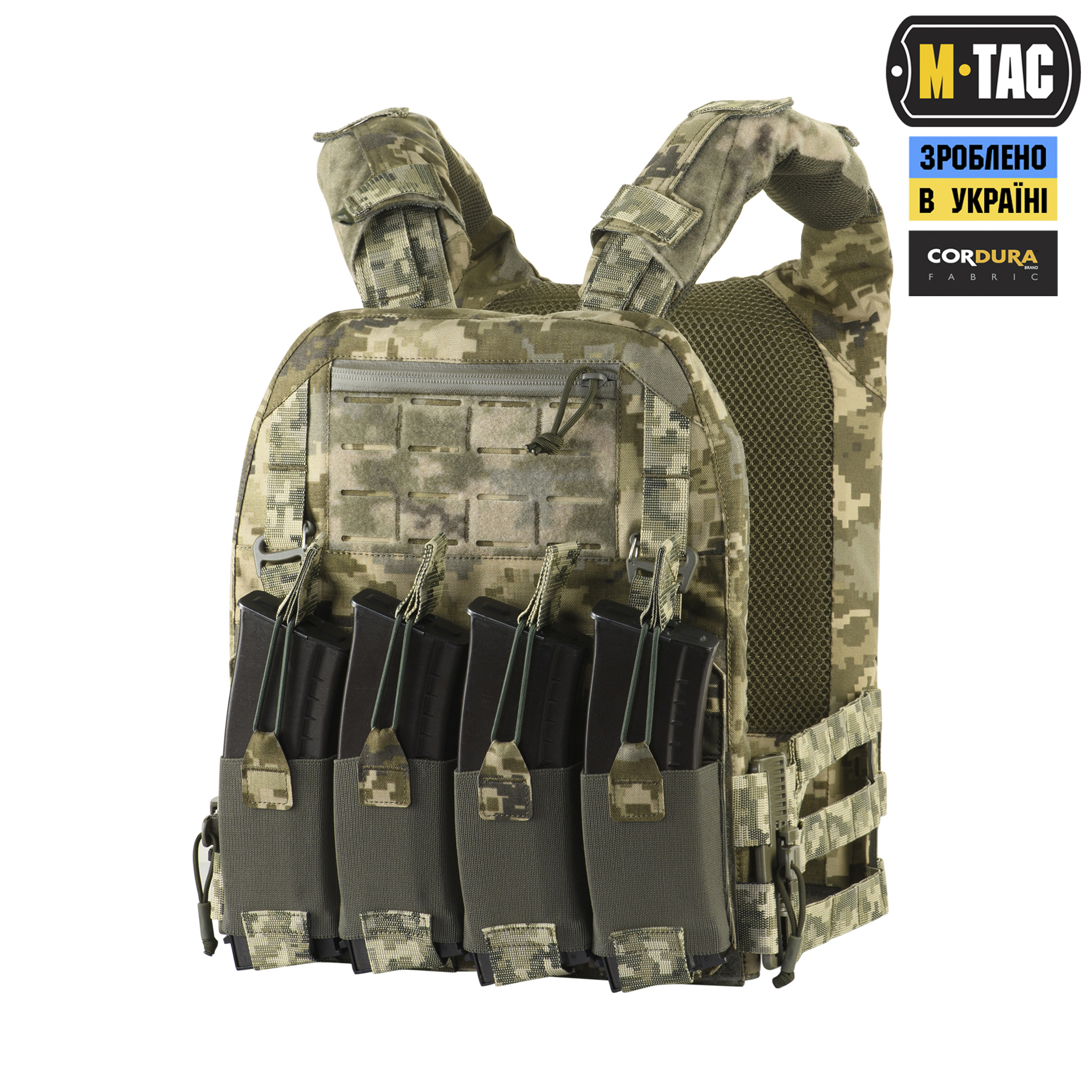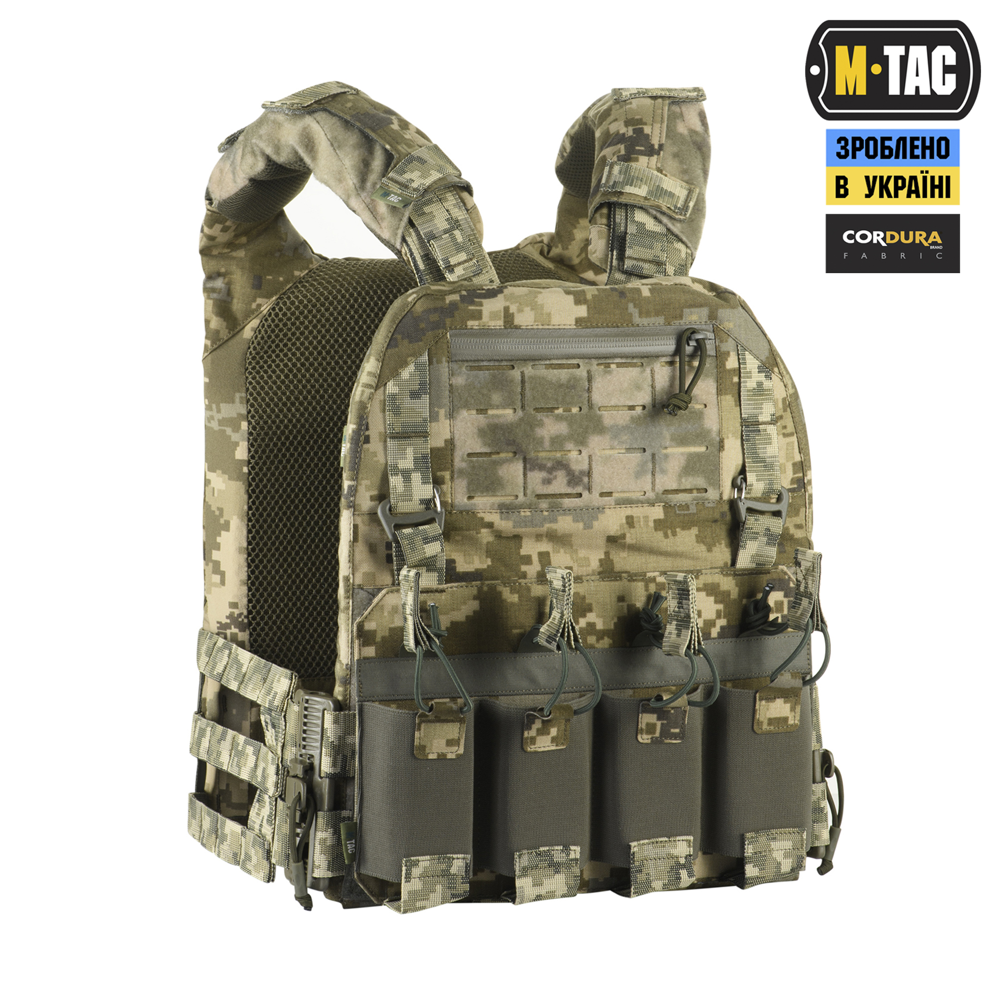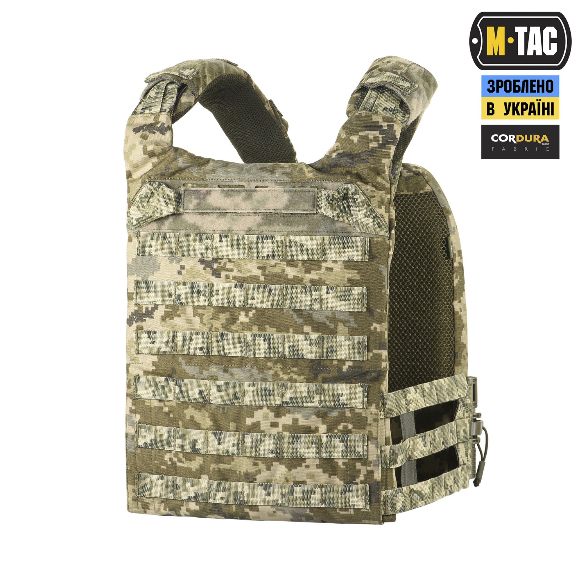 M-Tac плитоноска Cuirass QRS XL – це відмінний засіб індивідуального бронезахисту в лінійці PLATE CARRIER. Розроблена дизайнерами бренду під стандартні бронеплити ESAPI (USA) Extra Large (35.5 х 28 см). Також за допомогою внутрішніх строп плитоноску можна підлаштувати під розмір плити Large (33.7 х 26 см). Дана модель має систему швидкого скидання з фурнітури 2М ROC Buckle і регулюється за обємом. Виготовлена з високоякісного матеріалу Cordura 500D – надміцної тканини, стійкої до стирання і високих навантажень. З внутрішньої сторони плитоноски є вставки з 3D сітки, які забезпечують амортизацію та циркуляцію повітря. Ергономічні плечові лямки зручні у використанні й органічно повторюють контури тіла. Скелетоподібний камербанд значно зменшує вагу виробу і при необхідності дозволяє розмістити підсумки. На фронтальній частині виробу знаходиться Velcro-панель з прорізами, на яку можна закріпити молле-сумісне спорядження та ID-ідентифікатори. Вгорі плитоноски дизайнери бренду передбачили невелике адміністративне відділення на вологозахисній блискавці AquaGuard. Дана кишеня розрахована на зберігання невеликих плоских речей, таких як посвідчення, ключі, запальничка та інші предмети. Знизу бронежилета знаходиться швидкознімний модуль з 4 підсумками, які надійно утримують магазини. Щоб уникнути випадкового зривання з основи Velcro, він кріпиться до строп на плитоносці за допомогою карабінів Woojin. Ззаду є класичний молле-інтерфейс і ручка для евакуації, яка в похідному положенні фіксується до спинки панелями Velcro. Плитоноска Cuirass QRS XL стане відмінним вибором для любителів сучасного тактичного спорядження.  Завдяки своїм унікальним якостям Cordura широко застосовується в тактичному спорядженні військових, сил правопорядку і спеціального призначення. В основному – це матеріали з лінійною щільністю 1000d і 500d. Лінійна щільність – це співвідношення маси нитки матерії і її довжини. Вимірюється в Денье (denier). Ця одиниця виміру загалом застосовується для нейлонових виробів. Відповідно, чим вище цей показник, тим щільніша і важча тканина. Фізико-технічні характеристики CORDURA 1000D дуже високі, розривне навантаження становить близько 3000 Н, роздираюче навантаження близько 150 Н. Стійкість до стирання більше 50000 циклів. Використовується для одягу, чохлів, підсумків. Вироби, пошиті з матеріалів CORDURA безсумнівно пройдуть випробування часом і відстанню. CORDURA – це міцність, надійність і стиль. За показниками міцності вона поза конкуренцією.  Завдяки своїм унікальним якостям Cordura широко застосовується в тактичному спорядженні військових, сил правопорядку і спеціального призначення. В основному – це матеріали з лінійною щільністю 1000d і 500d. Лінійна щільність – це співвідношення маси нитки матерії і її довжини. Вимірюється в Денье (denier). Ця одиниця виміру загалом застосовується для нейлонових виробів. Відповідно, чим вище цей показник, тим щільніша і важча тканина. Фізико-технічні характеристики CORDURA 1000D дуже високі, розривне навантаження становить близько 3000 Н, роздираюче навантаження близько 150 Н. Стійкість до стирання більше 50000 циклів. Використовується для одягу, чохлів, підсумків. Вироби, пошиті з матеріалів CORDURA безсумнівно пройдуть випробування часом і відстанню. CORDURA – це міцність, надійність і стиль. За показниками міцності вона поза конкуренцією.