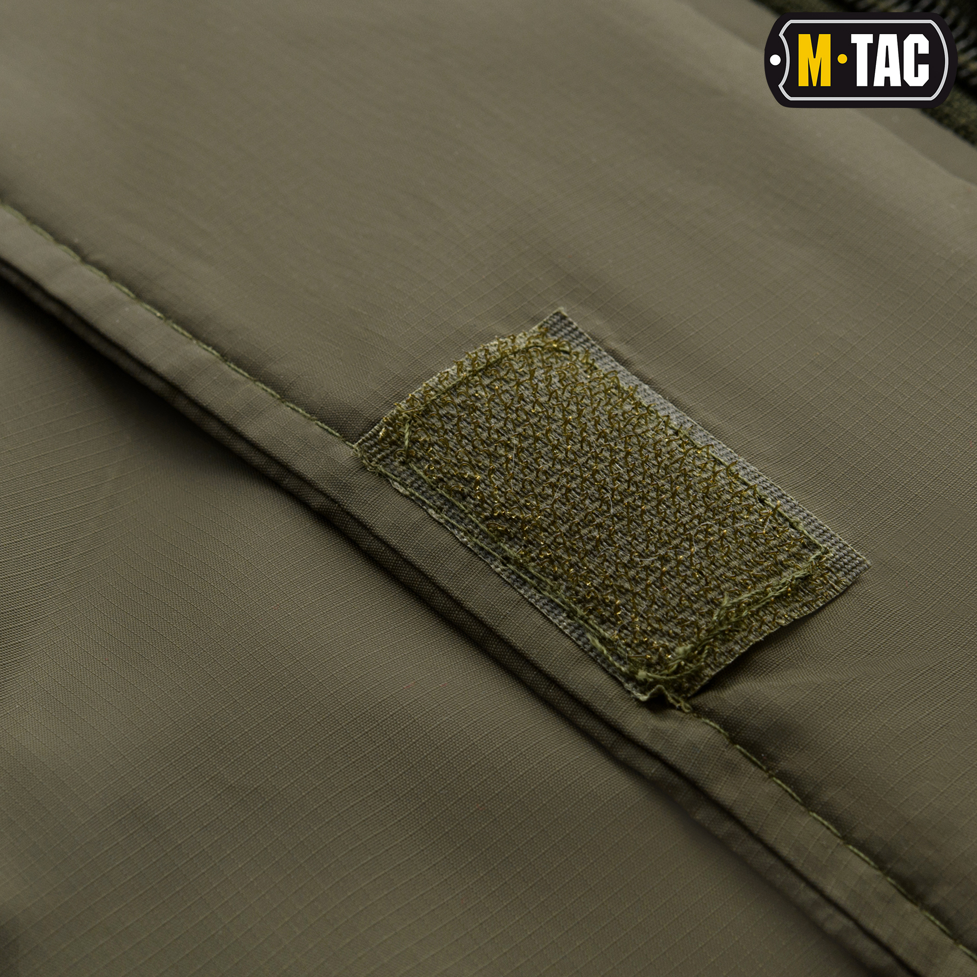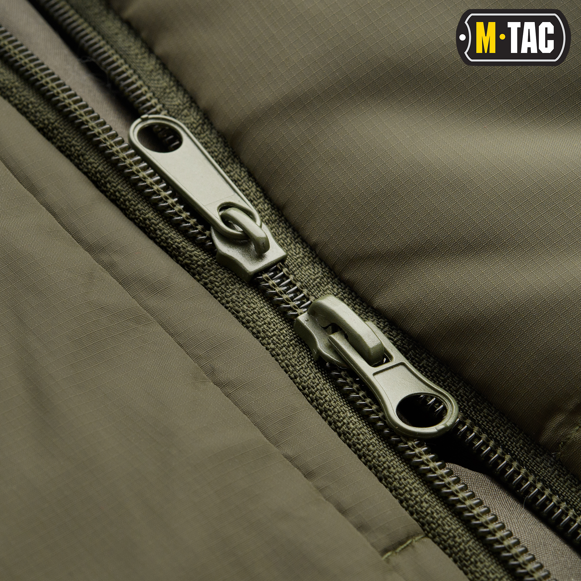 M-Tac спальник має капюшон, в який вбудований шнурок для його регулювання по обєму. Двостороння застібка-блискавка закривається зверху спеціальним клапаном, який захистить спальний мішок від продування. У комплект до спального мішка входить компресійний (транспортувальний) мішок.