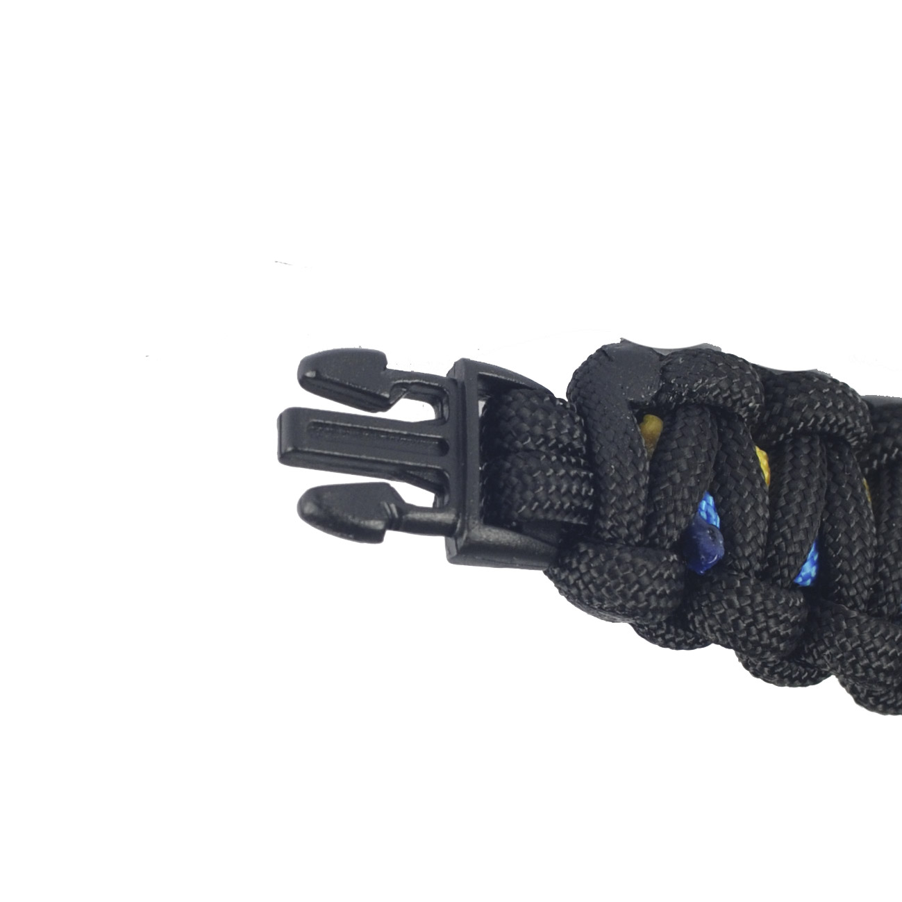 Патріотичний паракордовий браслет Каратель з прапором України або як його ще називають – браслет виживання. Виріб викликає непідробний захват у прихильників екстремального відпочинку та прихильників стилю мілітарі. У першому випадку прикраса може використовуватися як додатковий захід захисту. Будучи гладким, легким і міцним тросом, він витримує до 200 кг ваги на розтягнення і в розплетеному стані містить близько 3 метрів паракорду. У другому – застосовується виключно для доповнення зовнішнього вигляду, що відповідає військовій тематиці.