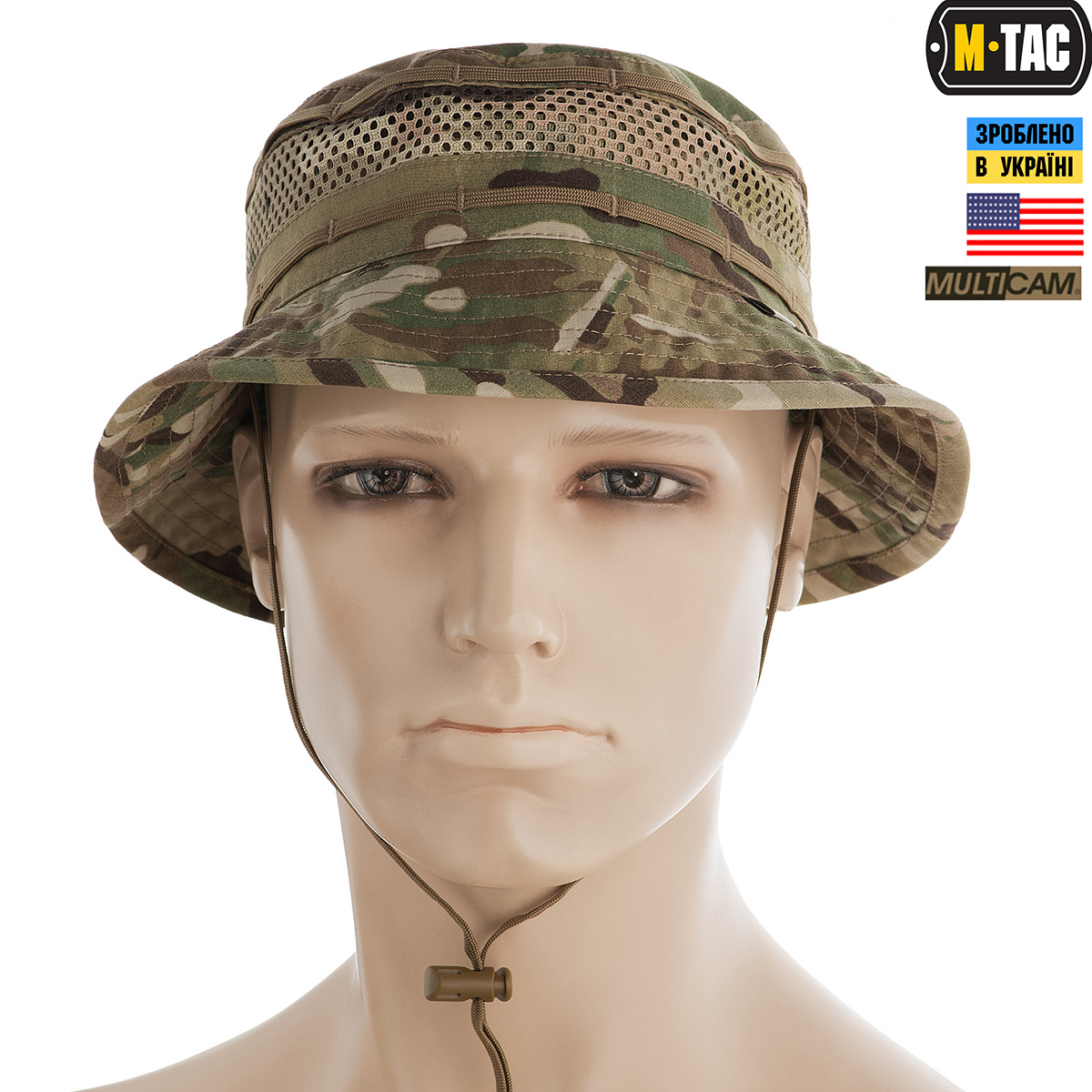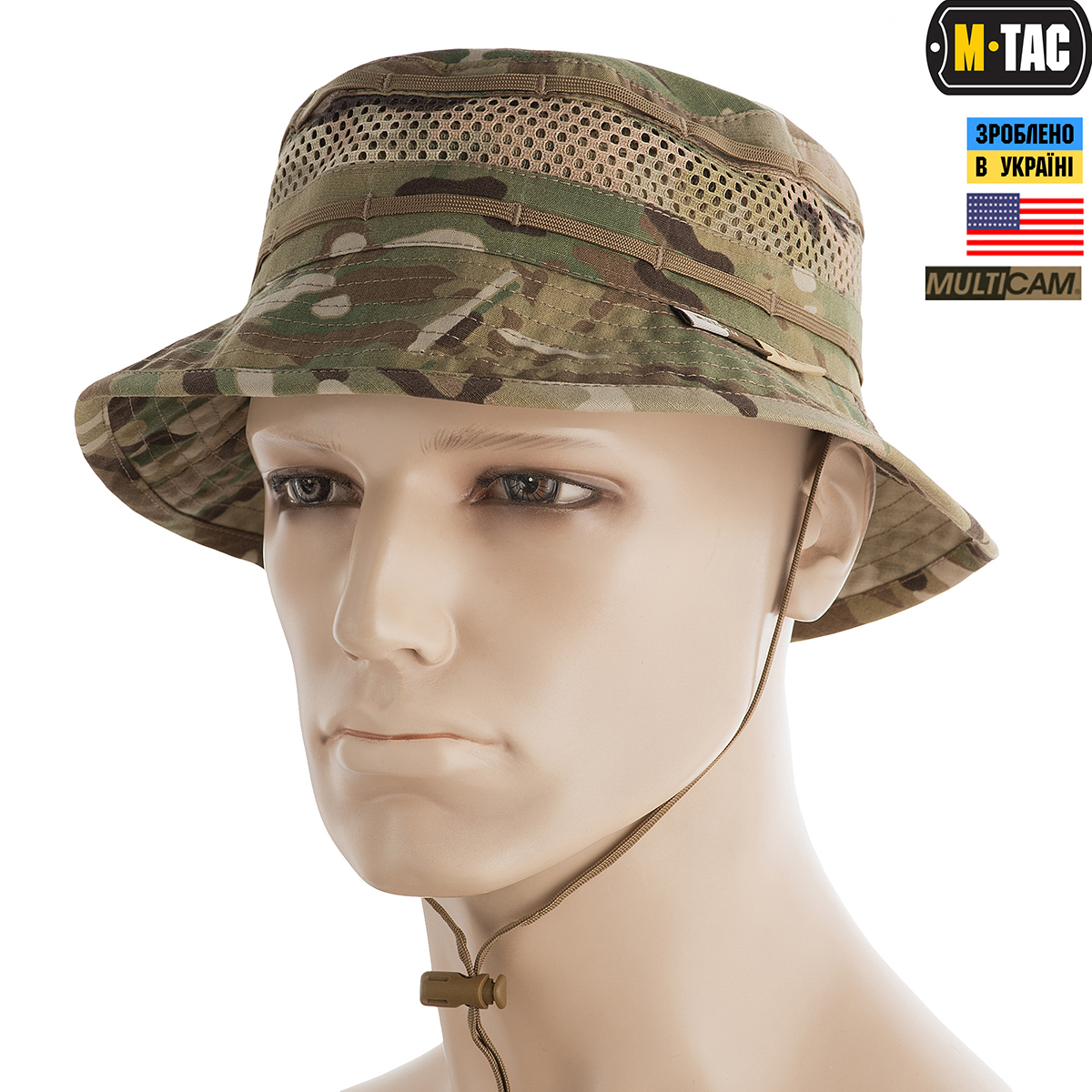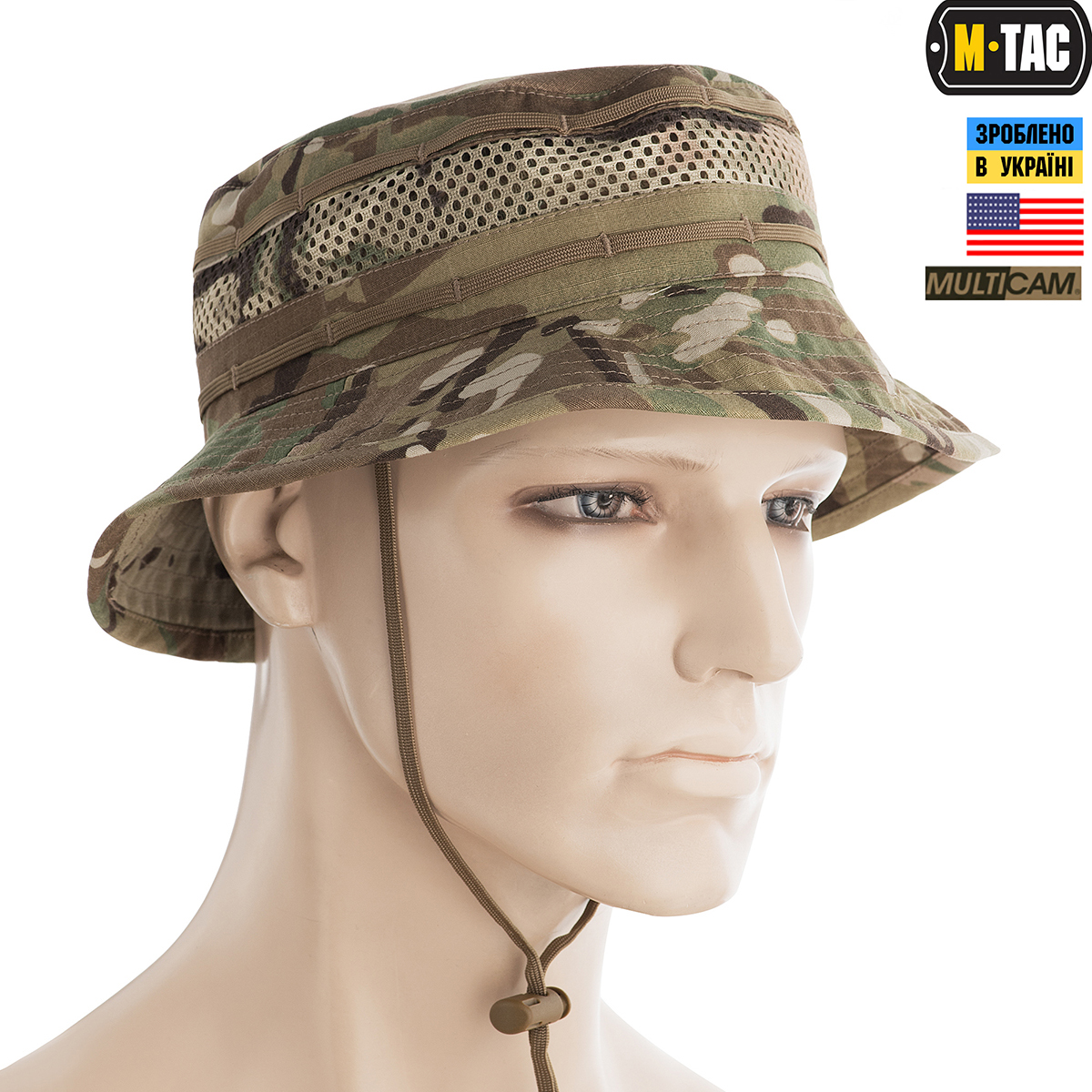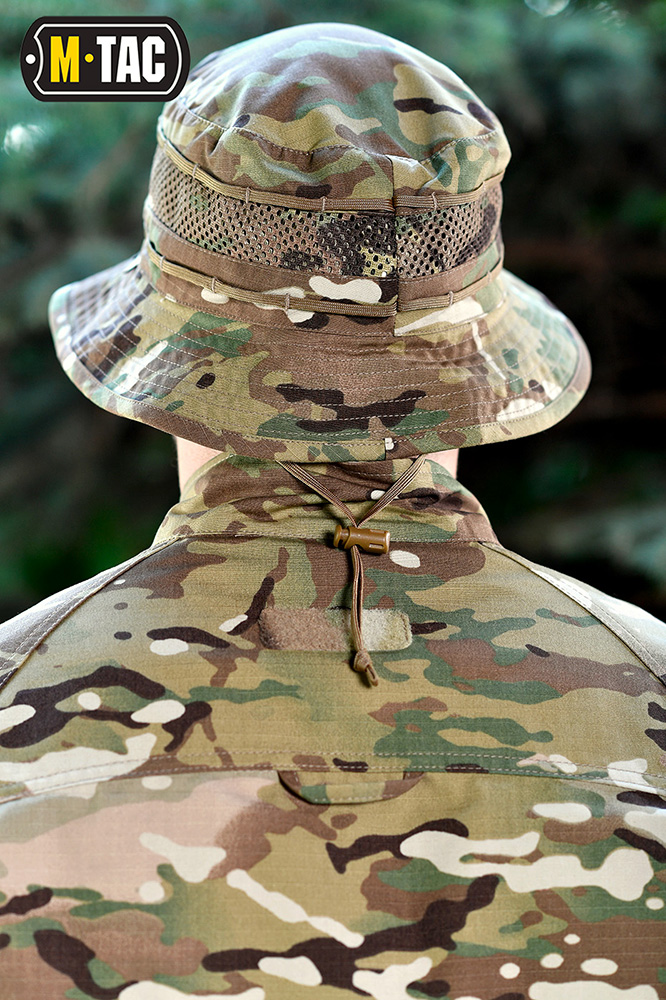 M-Tac панама з сіткою NYCO має крій з укороченими напівжорсткими полями. має крій з укороченими напівжорсткими полями. Тулія з нашитою по периметру стрічкою, яка розрахована на кріплення додаткових засобів маскування. Забезпечена спеціальним шнуром, який не дозволить панамі злетіти з голови під час сильних поривів вітру.