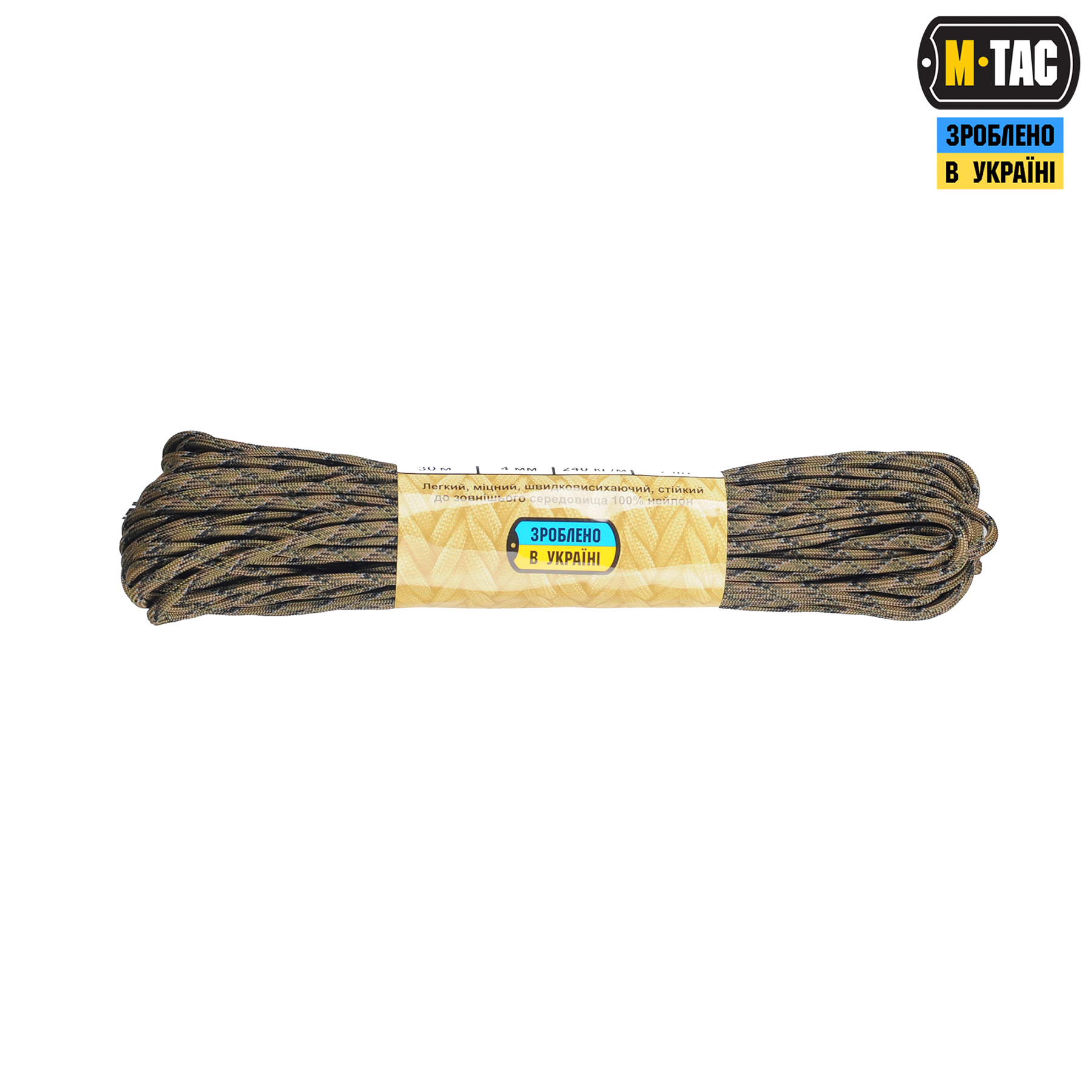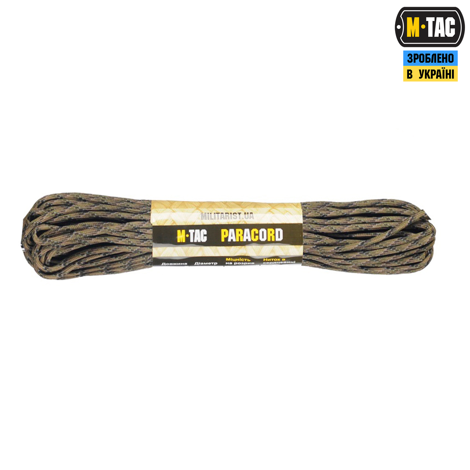M-Tac паракорд 550 type III – це нейлоновий шнур, який складається із зовнішнього обплетення (велика кількість переплетених волокон) та осердя (кілька нейлонових ниток, переплетених між собою), що забезпечує його міцність і невелику вагу.