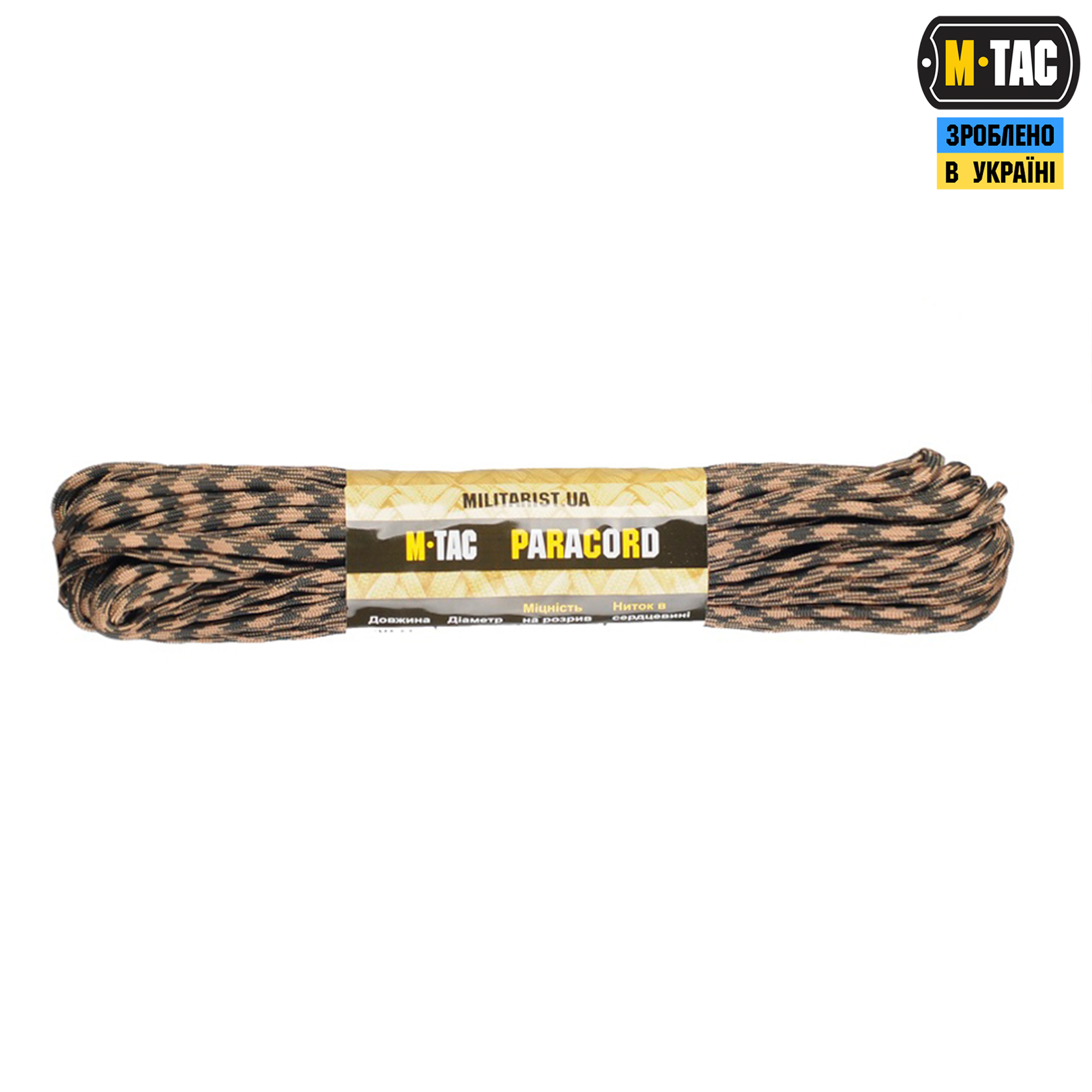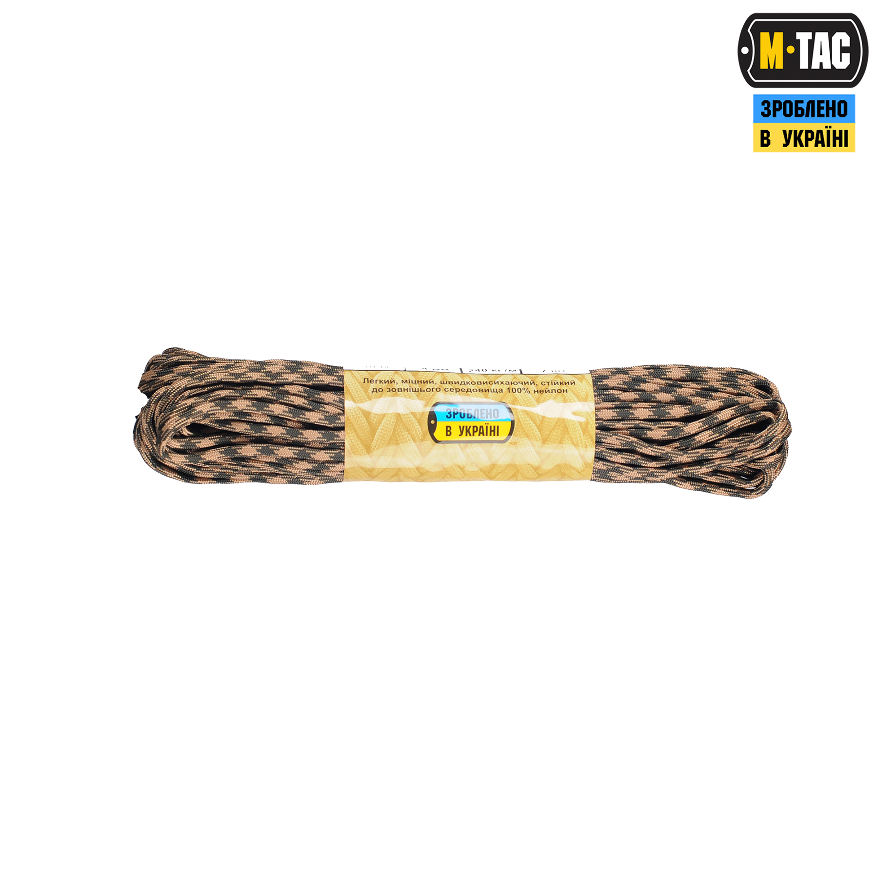 M-Tac паракорд 550 type III – це нейлоновий шнур, який складається із зовнішнього обплетення (велика кількість переплетених волокон) та осердя (кілька нейлонових ниток, переплетених між собою), що забезпечує його міцність і невелику вагу.