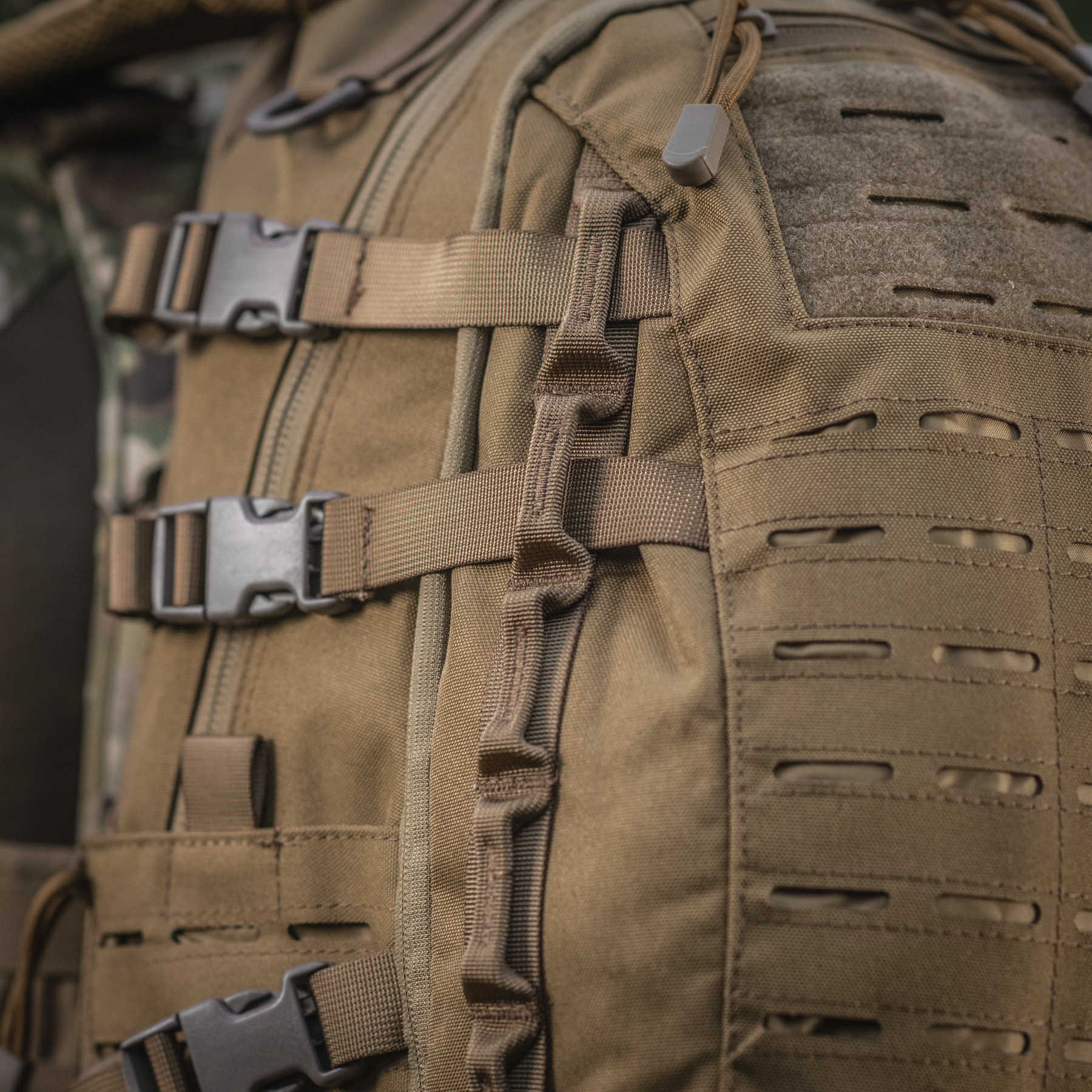 Ця модель виготовлена із міцних синтетичних матеріалів. Із боків та з фронтальної частини рюкзак оснащений системою MOLLE LASER CUT, що дозволяє при необхідності збільшити об’єм рюкзака додатковими підсумками.