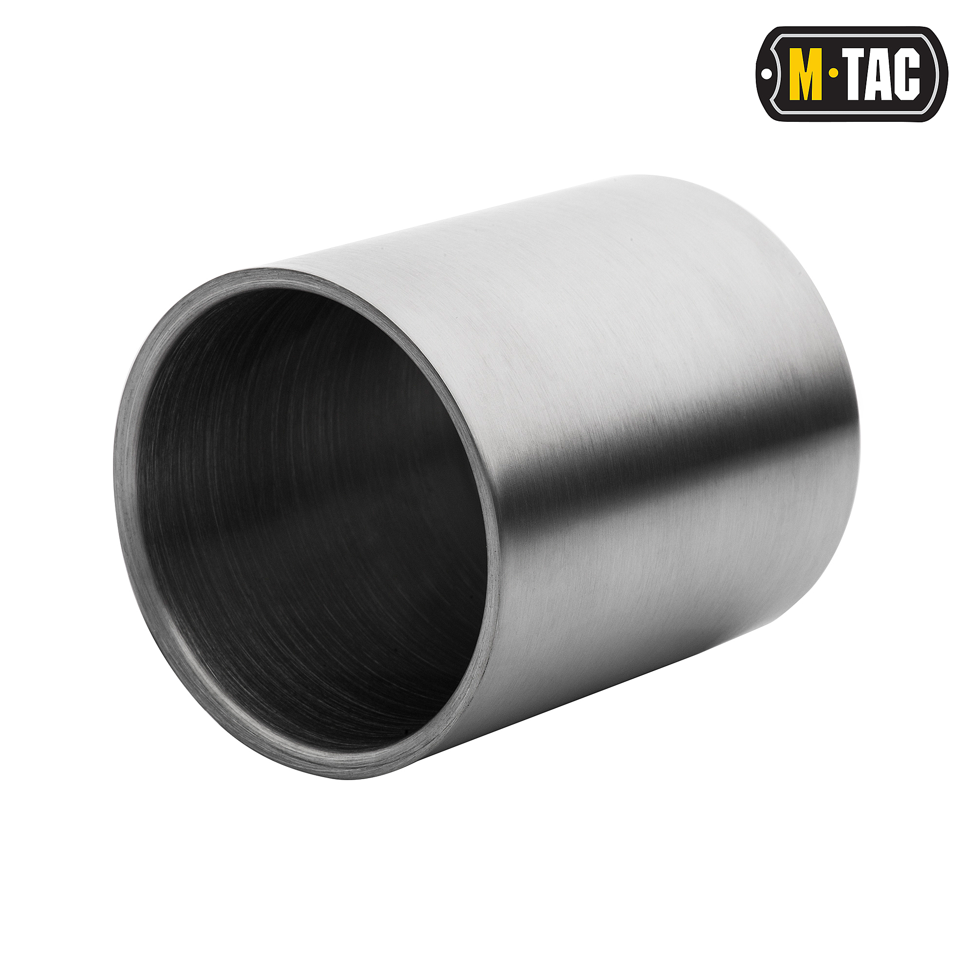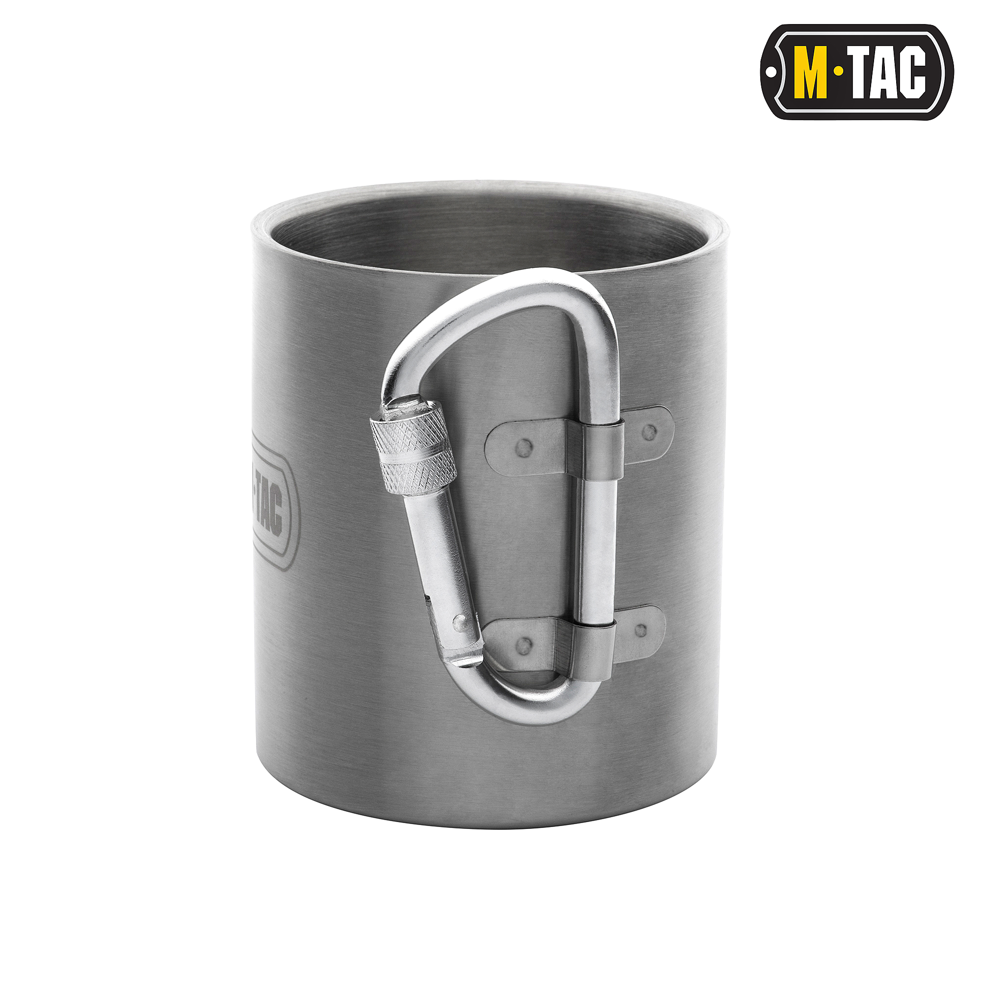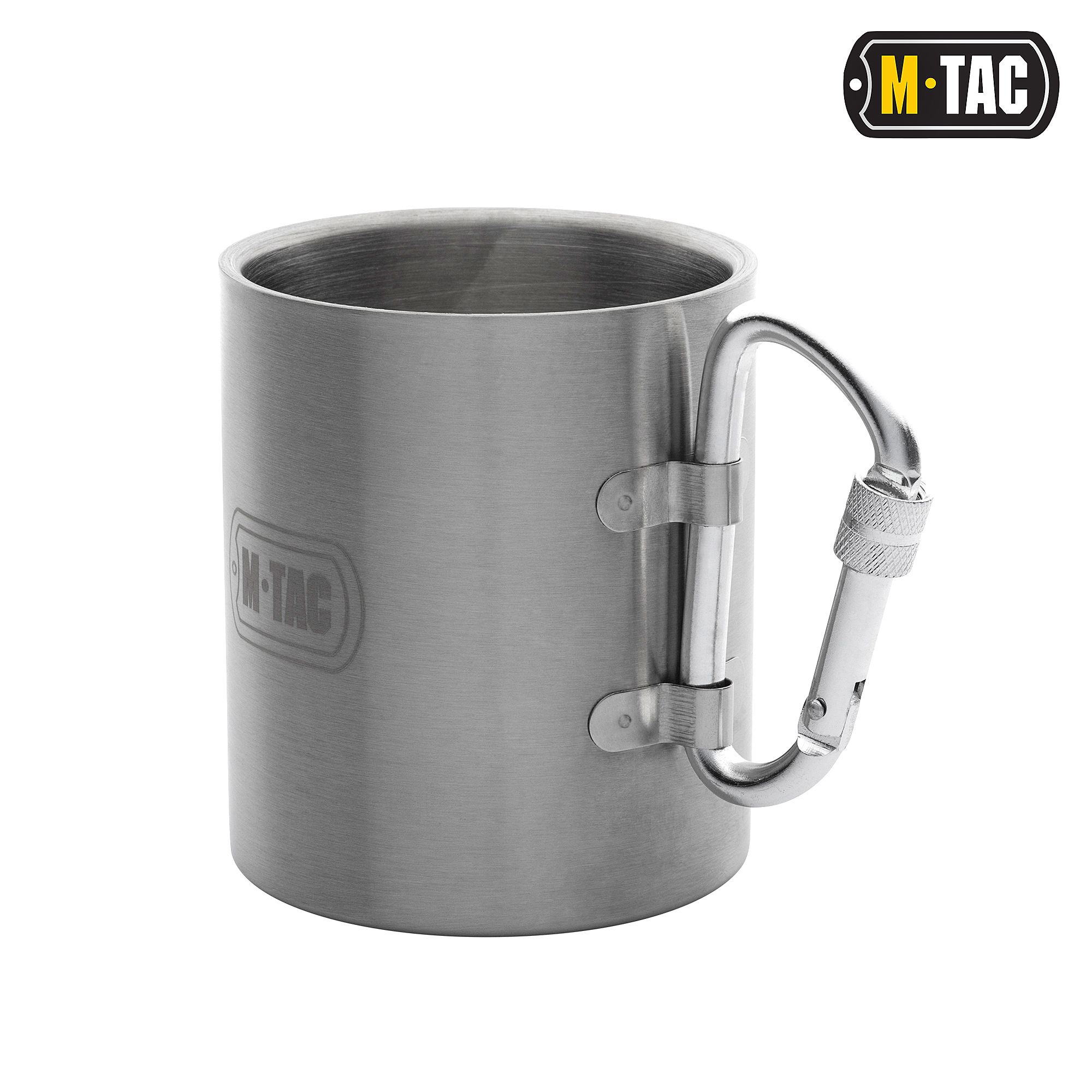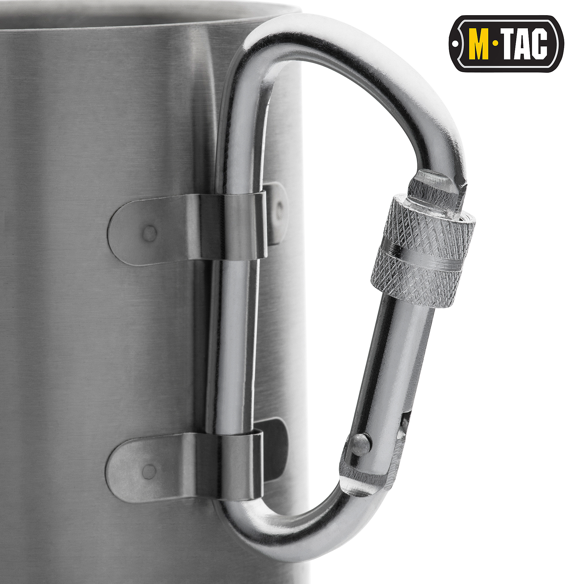 M-Tac термокухоль виготовлений з нержавіючої сталі, кухоль має жорстку і міцну конструкцію. Двошарові стінки, герметичний прошарок і вакуум не дозволяють напою вистигати, а зовнішнім стінкам нагріватись. Тому опіків з таким кухлем можна не боятися. Карабін використовується замість ручки. Карабін гвинтового типу.