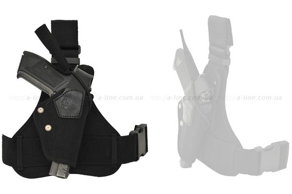 Тактична кобура на стегно (правостороння). Сама кобура формована, має поворотний механізм, який дозволяє її налаштувати під конкретного оператора. Крім кута нахилу також є регулювання і по висоті. Матеріал виготовлення – синтетика.