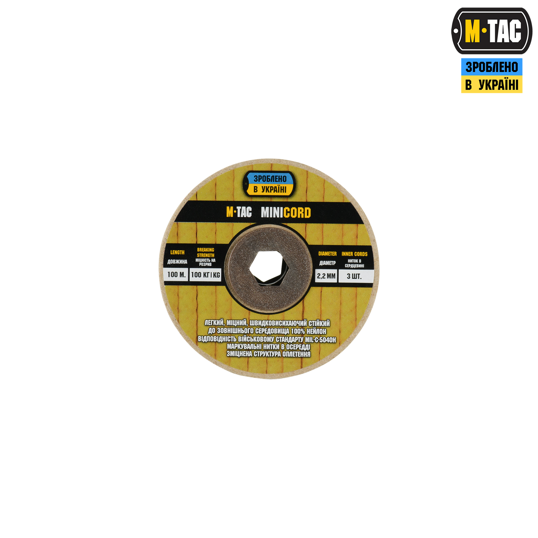 M-TAC ПАРАКОРД MINICORD 100M – стане незамінним елементом спорядження як у польових умовах, так і під час активного відпочинку. Паракорд відповідає військовому стандарту MIL-C-5040H (Military Specification) Міністерства оборони США, який визначає вимоги до плетеного нейлонового шнура. Виготовлений зі 100% нейлону – легкого та водночас зносостійкого матеріалу. Складається із зовнішнього обплетення (зі зміцненою структурою) та осердя, які в комбінації забезпечують високу міцність на розрив та невелику вагу. Для зручності використання, паракорд розміщено на котушці з пресованого картону.