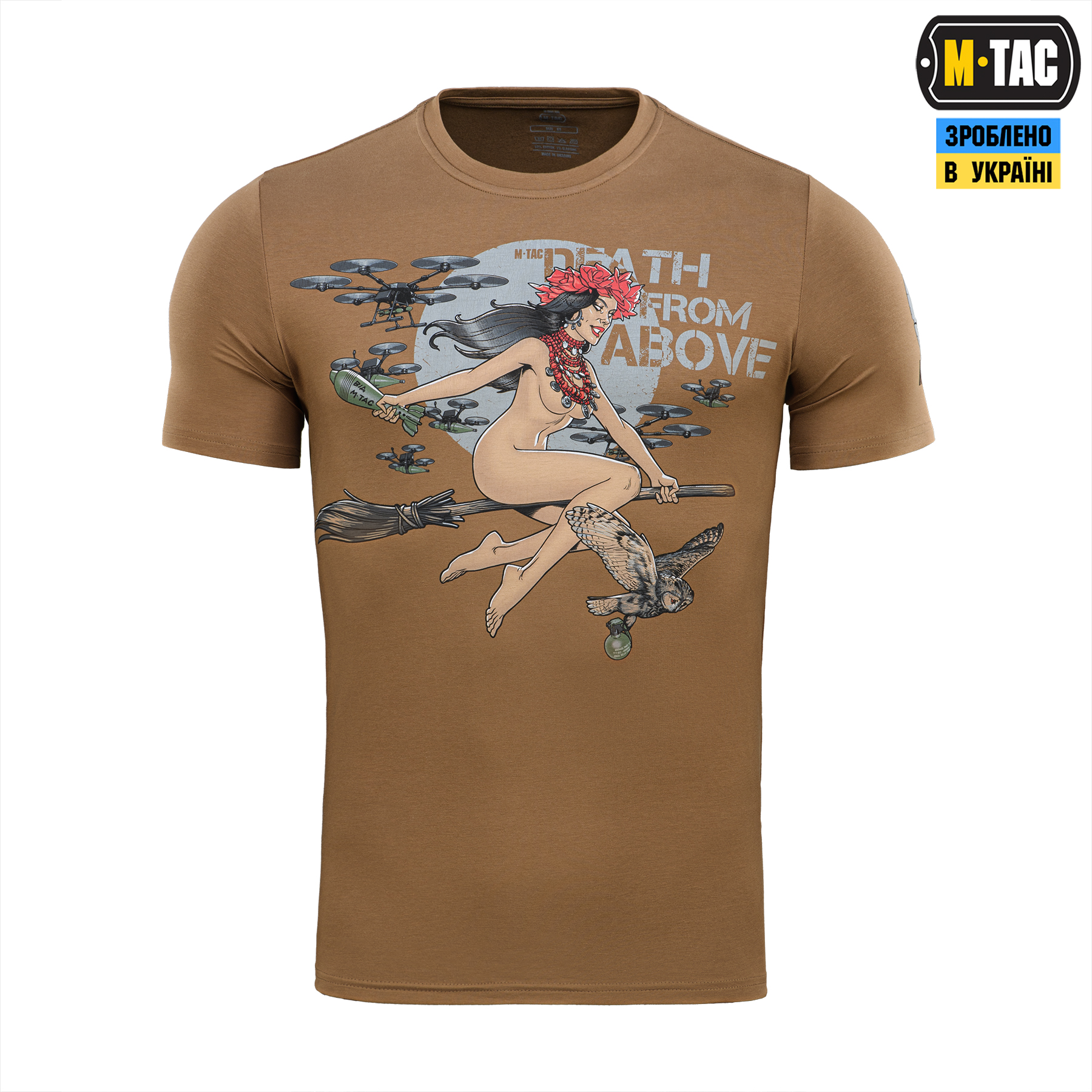 Вдершись на нашу землю з війною, ворог прирік себе бути проклятим до сьомого коліна. Тепер, легка смерть для нього здасться благословенням, а про пекло – доведеться благати вищі сили. Вся Україна стоїть за одну мету: від мужніх воїнів і сучасної зброї до сил природи та фольклорного єства. Тож ворогу варто озиратись догори, допоки смерть не засліпила його очі. Дизайнери бренду М-Тас, створили нову тематичну ФУТБОЛКУ DEATH FROM ABOVE, яка поєднує в собі витоки української культури та сьогодення. На принті зображена одна з найвідоміших представниць українського фольклору – відьма. Вона змінила свою звичну розвагу, зваблення чоловіків, на дещо більш корисне – ліквідацію окупантів. Поруч із нею, зображений смертоносний рій українських залізних пташок, а також сова, що віддавна вважається уособленням мудрості, а на сьогодні – символом військової розвідки. Тож, заручившись підтримкою природи та новітніх технологій, українська бешкетниця готова подарувати окупантам поцілунок смерті, а також нагадати, що їхня доля – лише в її руках. Матеріал: бавовна, еластан; Друк: MagnaColours® (Premium inks resist fading).