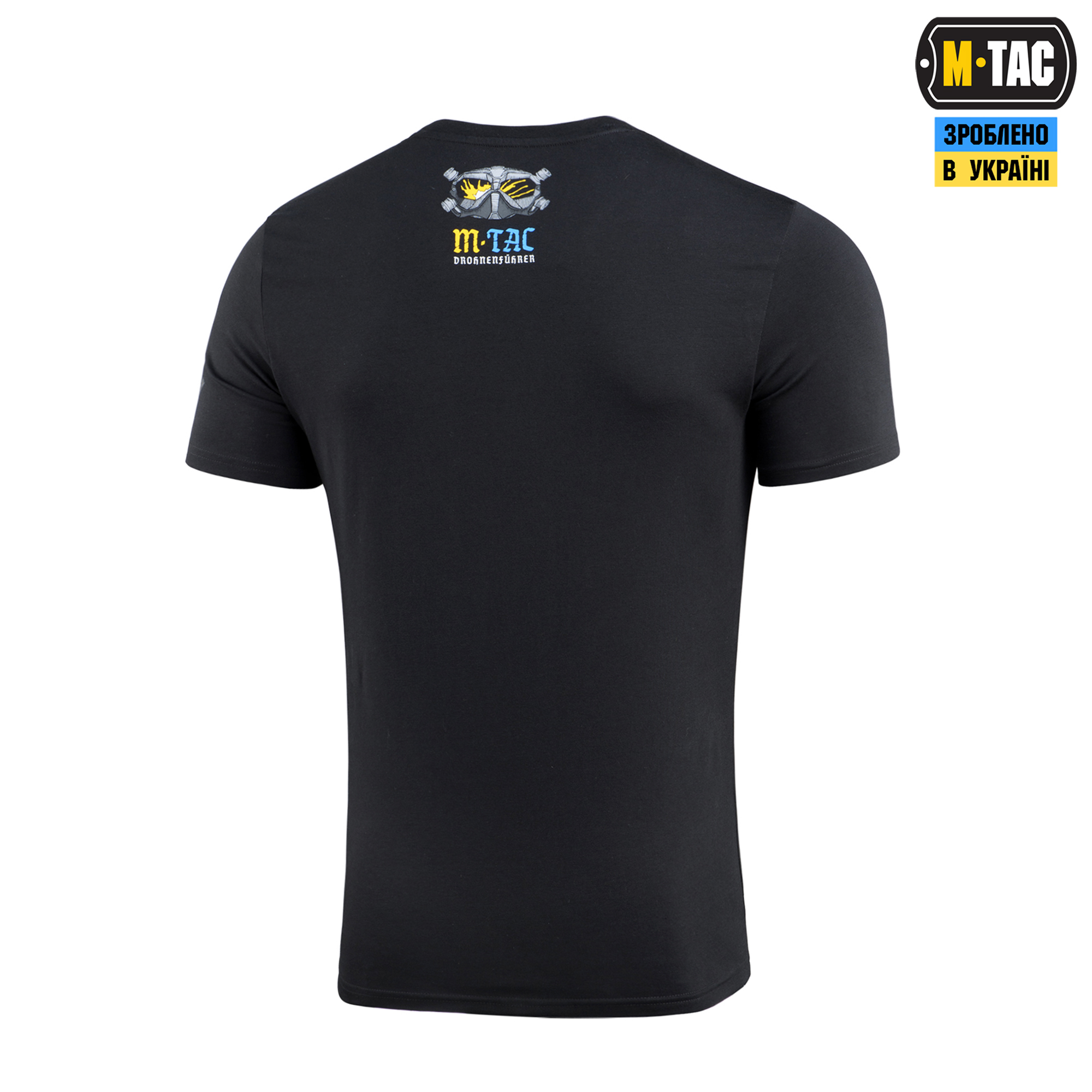 Майже щодня в Інтернеті з’являються відео, як українські війська знищують ворожу техніку й живу силу противника за допомогою дронів. Ці “люті пташки” є сучасною зброєю, яка, безумовно, впливає на хід війни та набирає особливої популярності. На футболці зображений стилізований оператор FPV дрона в спеціальних окулярах, що являють собою портативний екран, на якому оператор бачить картинку з камери дрона в режимі реального часу. Завдяки окулярам, оператор бачить місцевість так, ніби він сидить у його “кабіні”. Футболка має гумористично-саркастичну назву DROHNENFÜHRER, що з одного боку висміює пропагандистську тезу про “нацистів” та “націоналістичні угрупування”, а з іншого – уособлює справжніх висококласних професіоналів своєї справи, які вміють вправно керувати дронами та філігранно знищувати ворога. Ззаду футболки розміщено невелике зображення FPV окулярів, логотип бренду у патріотичних жовто-блакитних кольорах і напис DROHNENFÜHRER. На рукаві також зображений дрон, який несе “подарунок” окупантам. Футболка виготовлена з високоякісної тканини (бавовна, еластан). Зручний крій не сковує рухів, а тонкий еластичний трикотаж вдало підкреслює рельєф тіла та забезпечує комфорт при використанні. Матеріал: бавовна, еластан Друк: MagnaColours® (Premium inks resist fading)