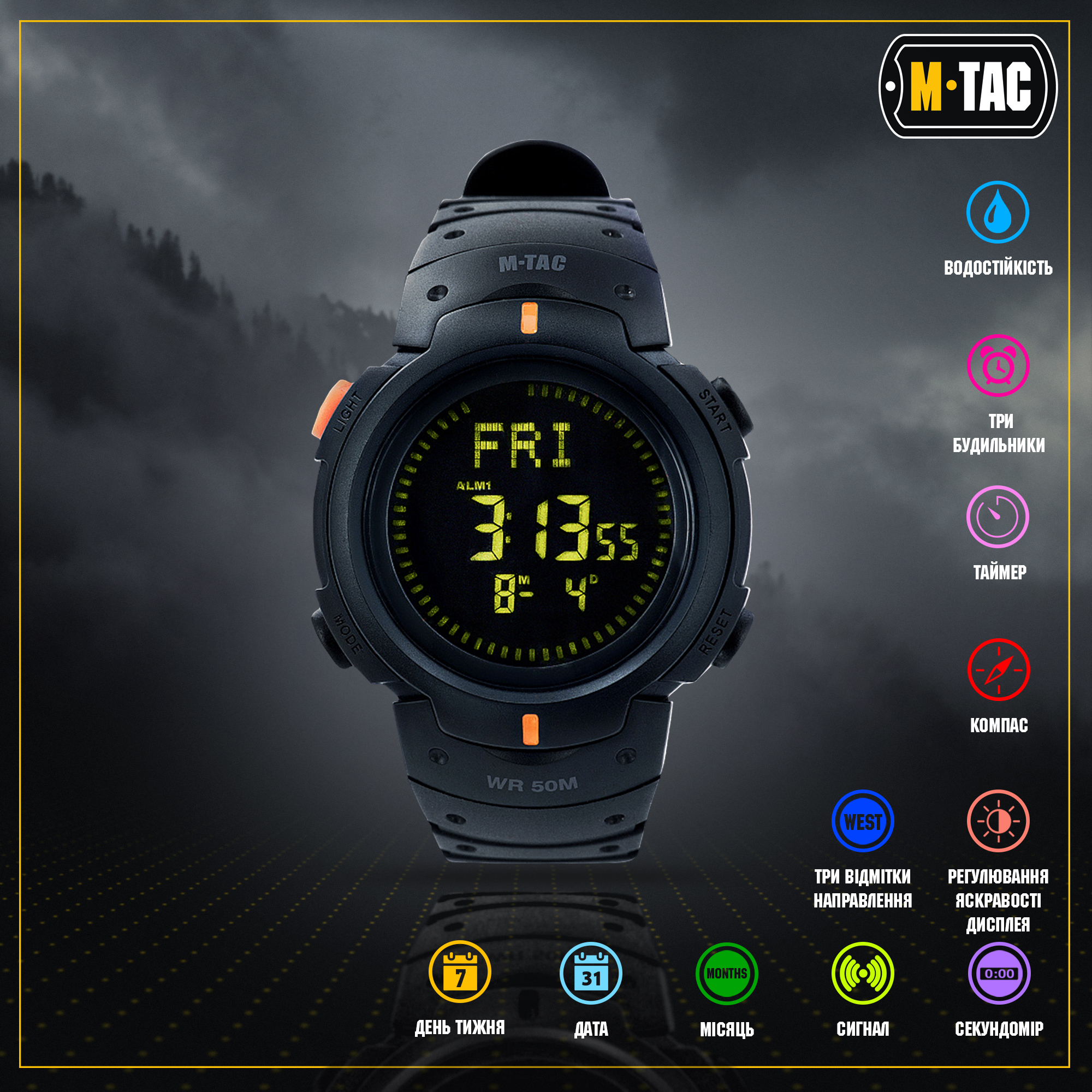 M-Tac годинник тактичний з компасом стане відмінним вибором тим, хто завжди звик бути в центрі подій. Ранкова пробіжка, похід, екстремальні види спорту – в будь-якій, навіть самій складній ситуації. Зручні і практичні, вони водонепроникні, забезпечені зручним пластиковим ремінцем і секундоміром для максимально точного визначення часу. Основною фішкою цього годинника є наявність електронного компаса, який не дасть заблукати своєму власникові.
