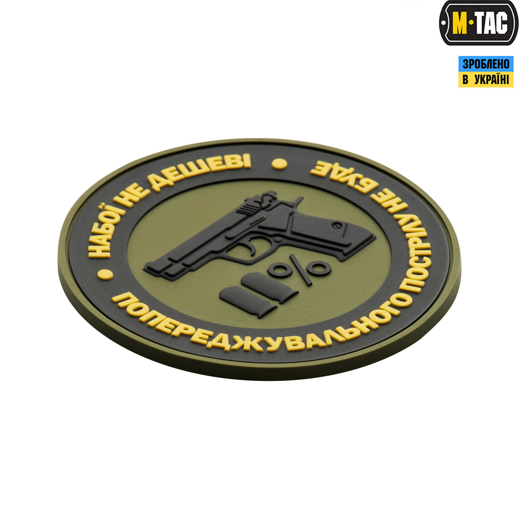 Нарукавна нашивка Набої НЕ дешеві – так званий morale patch. На M-Tac нашивки Набої НЕ дешеві зображений пістолет з патронами, які символізують рух 11% і напис по колу: “набої НЕ дешеві – попереджувальних пострілу НЕ буде”. Патч кріпиться на нарукавний майданчик з липучки велкро, (на самому патчі зі зворотного боку пришита відповідна частина липучки), або на спорядження – рюкзаки, каски та інше. Статутною, як і всі моральні патчі, дана нашивка не є, але може носитися як в зоні БД, так і за її межами.