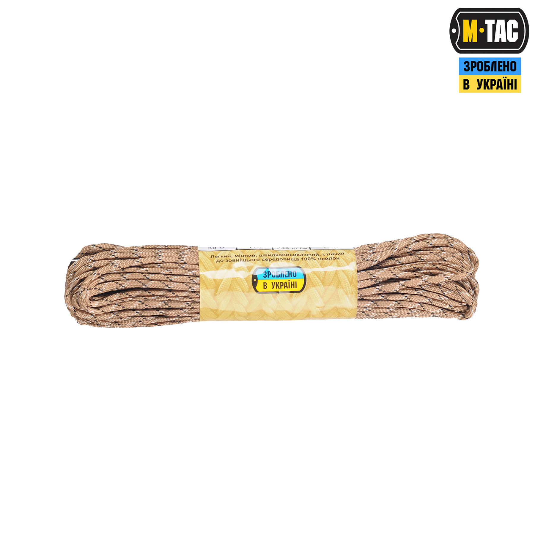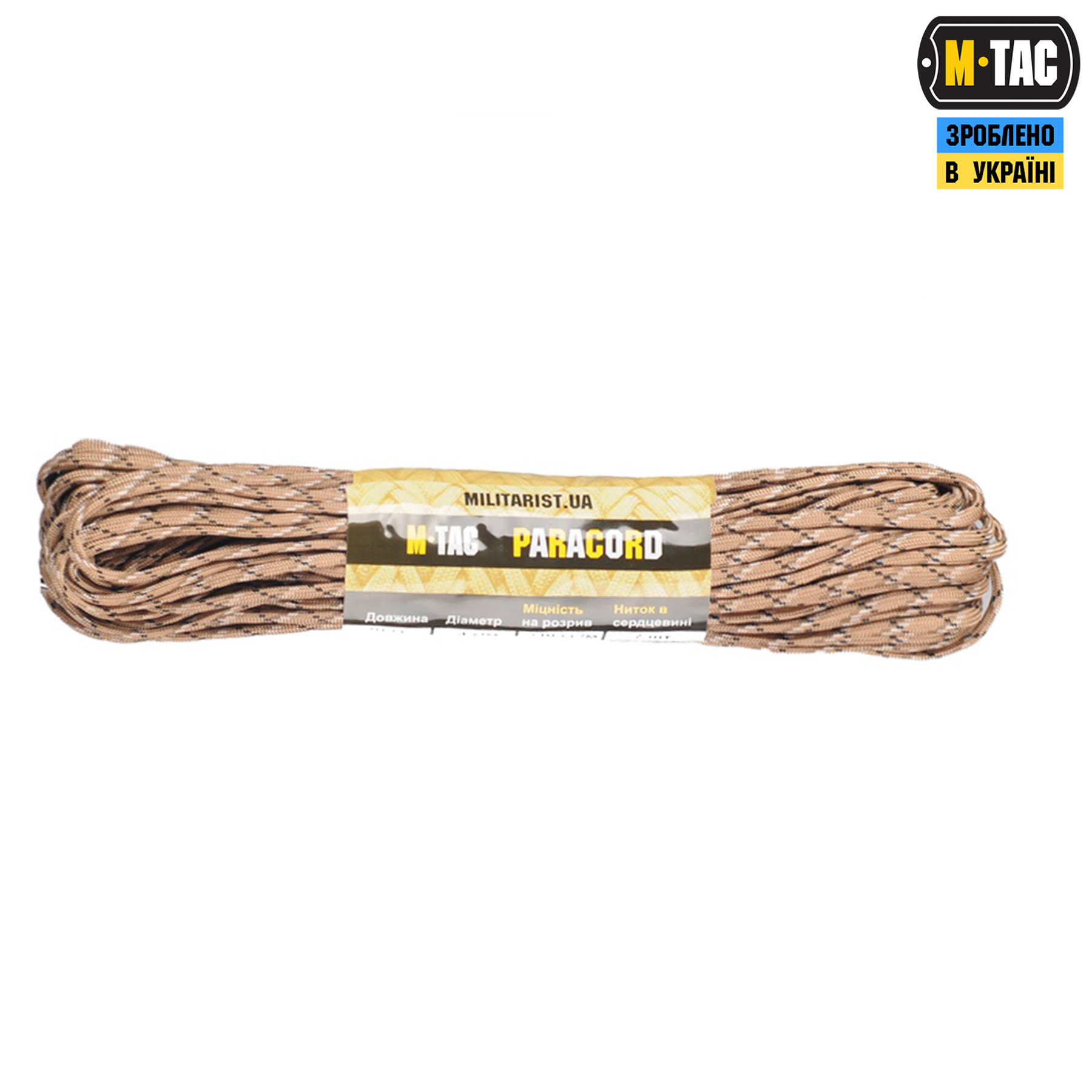 M-Tac паракорд 550 type III – це нейлоновий шнур, який складається із зовнішнього обплетення (велика кількість переплетених волокон) та осердя (кілька нейлонових ниток, переплетених між собою), що забезпечує його міцність і невелику вагу.